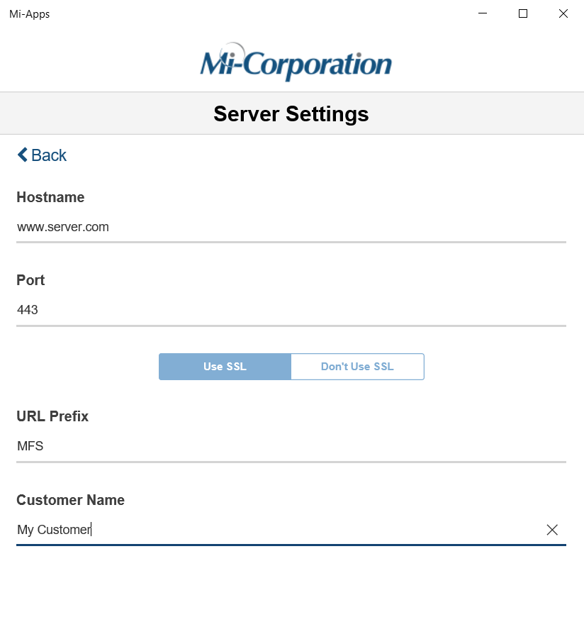 Enter your hostname, modify the Port, SSL Use, URL Prefix, and Customer Name as needed and then tap the Back link in the top left.